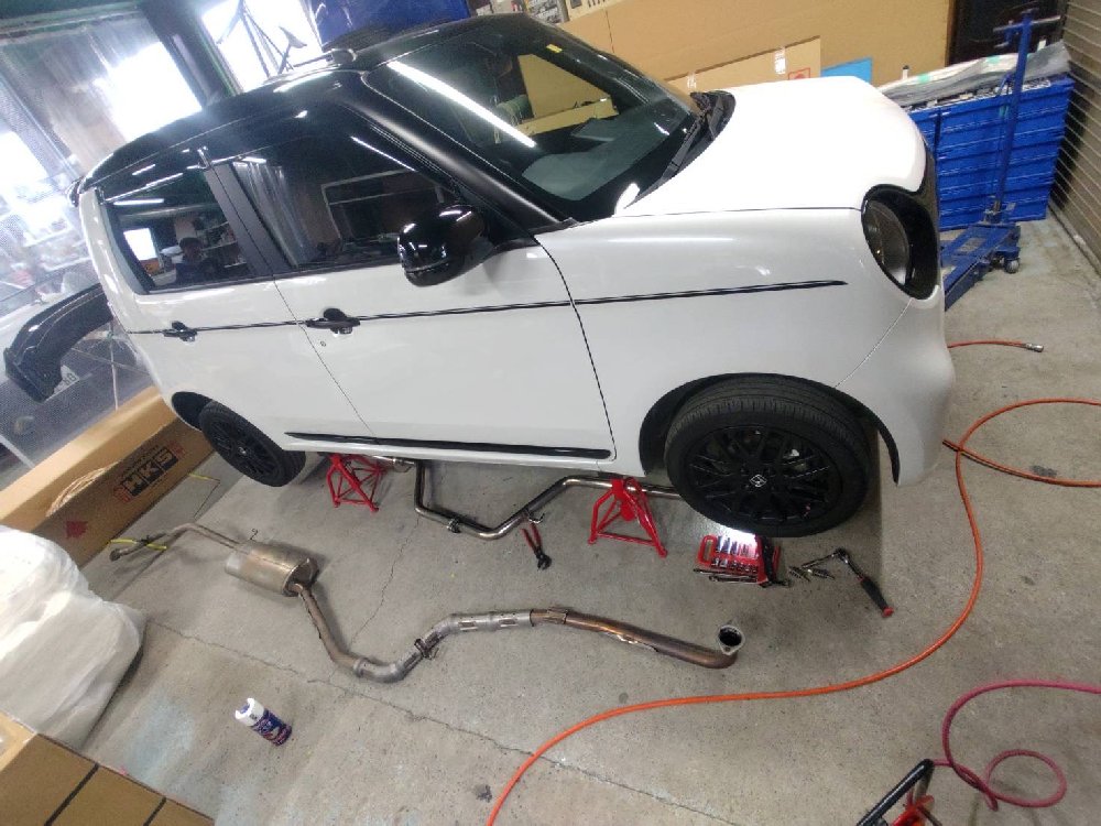 2024年01月20日 19:51 本日の作業はマフラー交換です。車両はN-ONE。ノーマルマフラーが根元から1本モノで外すのにリフトが欲しいところです。。HKSさんのマフラーは3分割でとても組みやすいです♪