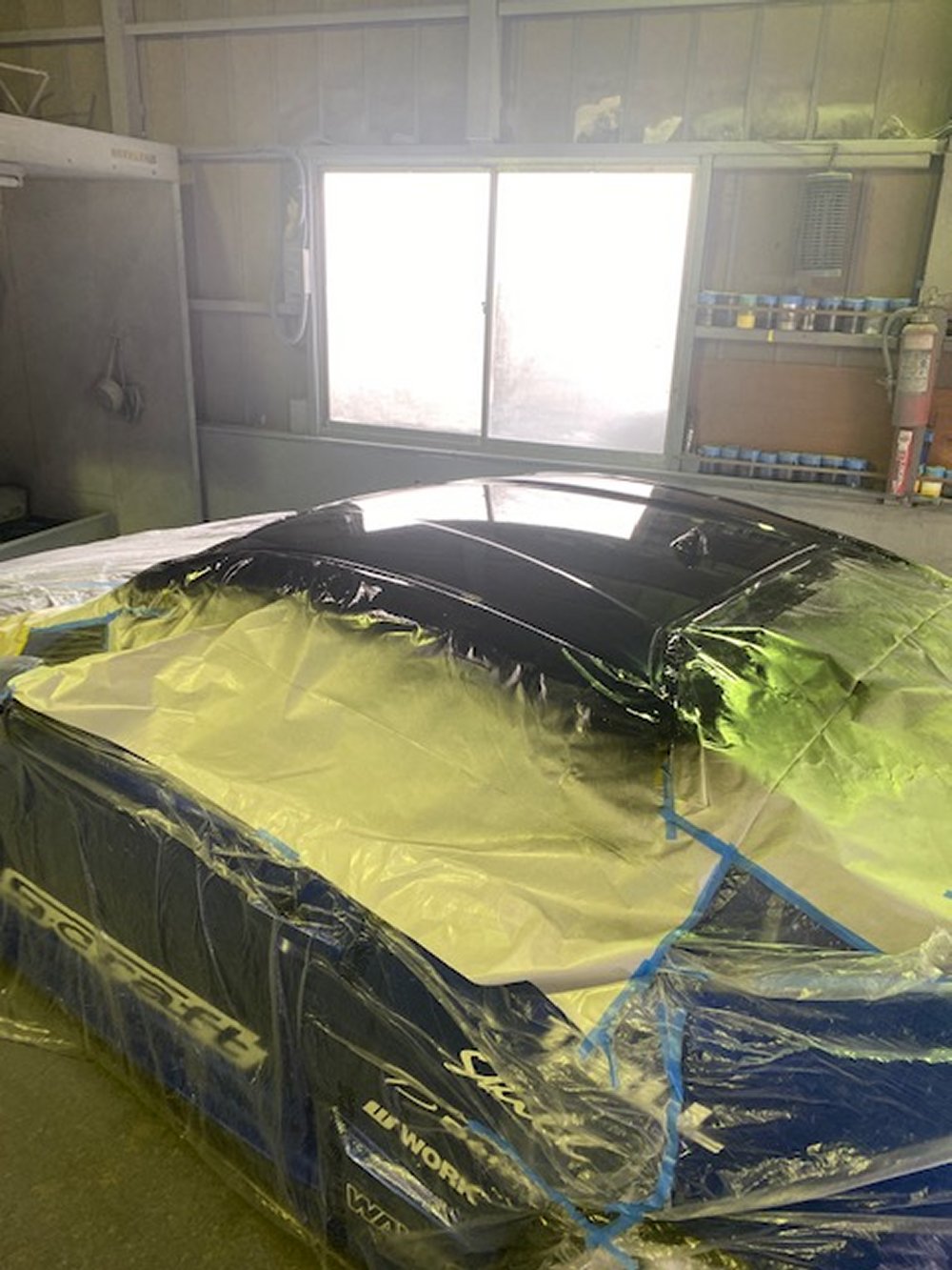 2020年07月09日 19:18 デモカーのBRZの屋根の修理です。以前、屋根にヘコミがあったので修理してブラックで塗装。少々時間が経ってパテ引けが出てきてしまったので、やり直しですね。下地をしっかりやり直してブラックで塗ります。ブルーパール多めで♪ボディー色ではなく屋根だけブラックもなかなかカッコいいですね♪