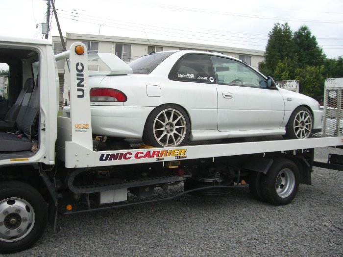 ローダーに乗せられた車を見てさみしそうなお客さんを背に工場に向けて出発。