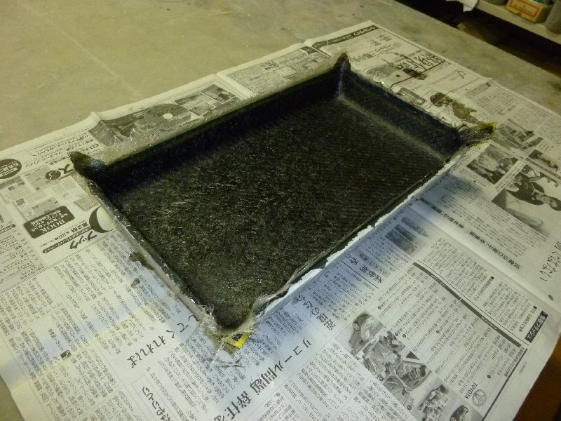 量産用の型にカーボンとグラスファイバーを重ねて貼り付けていきます。
