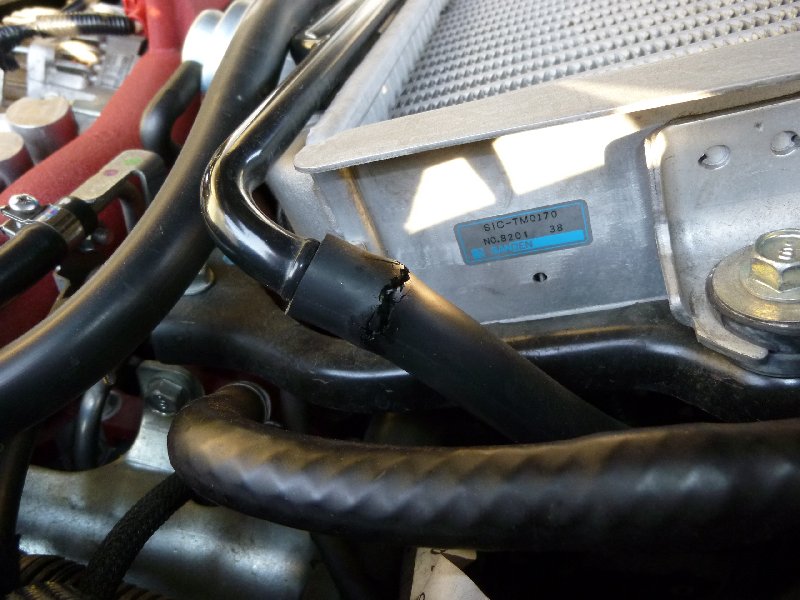 違う作業でボンネットを開けていたのですがエンジンルームを見渡しているとインタークーラー横のホースに亀裂が・・・